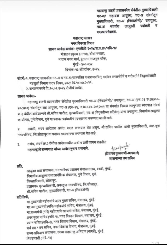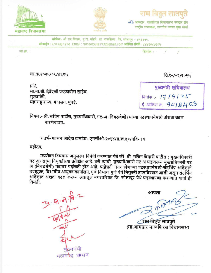 महाराष्ट्र राज्याचे लाडके मुख्यमंत्री देवेंद्रजी फडणवीस यांच्याकडे भारतीय जनता युवा मोर्चाचे राष्ट्रीय उपाध्यक्ष व माळशिरस विधानसभेचे लोकप्रिय दमदार मा. आ. राम सातपुते यांनी पत्रान्वये श्री. सचिन पाटील यांची अकलूज नगर परिषदेवर मुख्याधिकारी गट अ निवडश्रेणी यांच्या पदस्थापनेत अंशतः बदल करून नियुक्ती करावी असे पत्र दिले होते. लाडके मुख्यमंत्री यांनी सदर पत्रावर शेरा मारलेला असल्याने महाराष्ट्र शासनाच्या नगर विकास शासनाच्या उपसचिव प्रियांका कुलकर्णी छापवाले यांनी आदेशान्वये अकलूज नगर परिषदेच्या मुख्याधिकारीपदी श्री. सचिन पाटील यांची नियुक्ती केलेली आहे. भाजपचे विधान परिषदेचे आमदार रणजीतसिंह विजयसिंह मोहिते पाटील यांनी अकलूज नगर परिषदेच्या मुख्याधिकारी पदी अन्य व्यक्तीचे नाव दिलेले होते. आमदार रणजितसिंह मोहिते पाटील यांच्या पत्राला भाजप महायुतीच्या सरकारने दिली केराची टोपली, अशी राजकीय वर्तुळामध्ये चर्चा सुरू आहे.