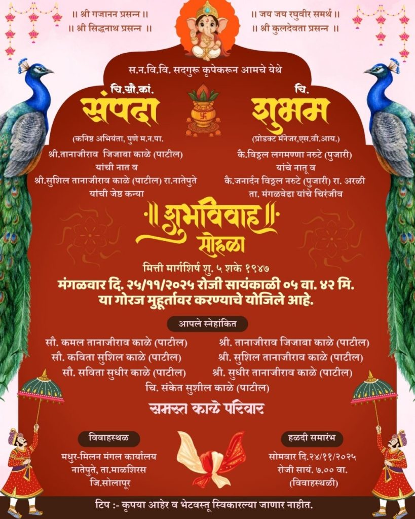 चि. सौ. कां. संपदा काळे (पाटील), नातेपुते आणि चि. शुभम नरुटे (पुजारी), अरळी यांचा शाही शुभ विवाह सोहळा होणार संपन्न