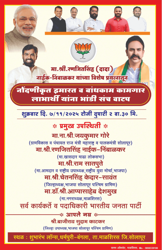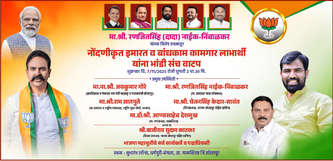 माढा लोकसभा मतदारसंघाचे कार्यतत्पर व पाणीदार माजी खासदार रणजीतसिंह नाईक निंबाळकर यांच्या विशेष प्रयत्नातून नोंदणीकृत इमारत व बांधकाम कामगार लाभार्थ्यांना भांडी संच वाटप शुक्रवार दि. ७/११/२०२५ रोजी दुपारी २ वा. ३० मि. शुभारंभ लॉन्स धर्मपुरी बंगला, ता. माळशिरस येथे करण्यात येणार आहे.