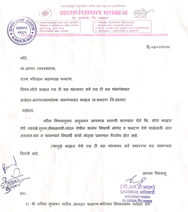 काळज, ता. फलटण गावचे माजी उपसरपंच श्री. सचिन गाढवे पाटील यांनी मागील दहा महिन्यापूर्वी महाराष्ट्र राज्य परिवहन महामंडळ फलटण यांना काळज या ठिकाणी फलटण आगाराच्या सर्व एसटी बस थांबावे यासाठी फलटण आगार प्रमुख श्री. चव्हाण साहेब यांना काळज ग्रामपंचायतीचा प्रस्ताव व आमदार सचिन पाटील यांचे निवेदन दिले होते. व मागील दहा महिन्यांपासुन आगार प्रमुखांना वारंवार विनंती करत आहेत. तरीसुद्धा अजूनपर्यंत आगर प्रमुखांनी या विषयावर कोणताही तोडगा काढला नाही.