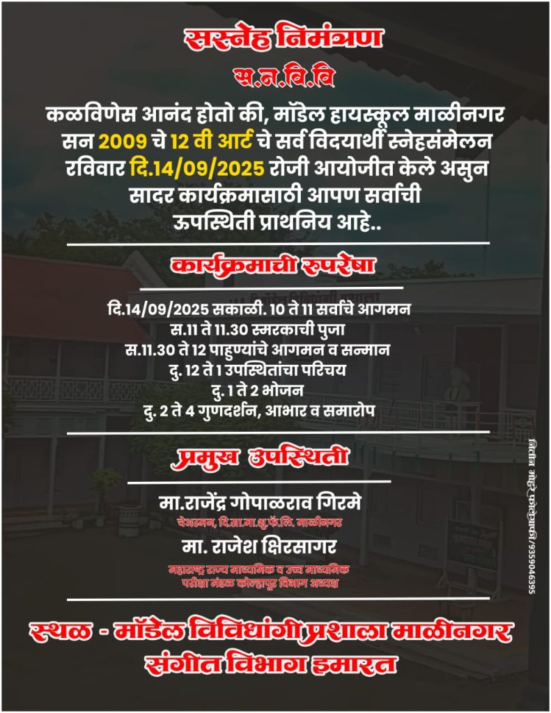 माळीनगर, ता. माळशिरस येथील मॉडेल विविधांगी प्रशालेच्या सन 2009 च्या बारावी आर्ट्स च्या सर्व विद्यार्थ्यांच्या स्नेहसंमेलनाच्या कार्यक्रमाचे आयोजन रविवार दि. १४/९/२०२५ रोजी मॉडेल विविधांगी प्रशाला माळीनगर संगीत विभाग इमारत येथे करण्यात आले आहे.