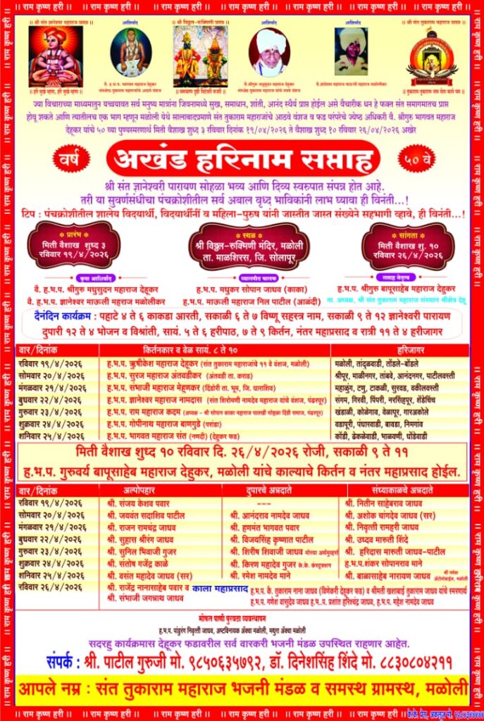 श्री संत जगद्गुरु तुकाराम महाराज यांचे आठवे वंशज व फड परंपरेचे ज्येष्ठ अधिकारी वैकुंठवासी श्री गुरु भागवत महाराज देहूकर यांचे 50 व्या पुण्यस्मरणार्थ रविवार दि. 19/04/2026 ते रविवार दि. 26/04/2026 अखेर अखंड हरिनाम सप्ताहाचे आयोजन संत तुकाराम महाराज भजनी मंडळ व समस्त ग्रामस्थ, मळोली यांच्या वतीने श्री विठ्ठल रुक्मिणी मंदिर, मळोली, ता. माळशिरस, जि. सोलापूर येथे अखंड हरिनाम सप्ताहाचे आयोजन केलेले आहे. सदर सप्ताहाचे 50 वे वर्ष म्हणजेच अर्धशतक पूर्ण होत आहे.