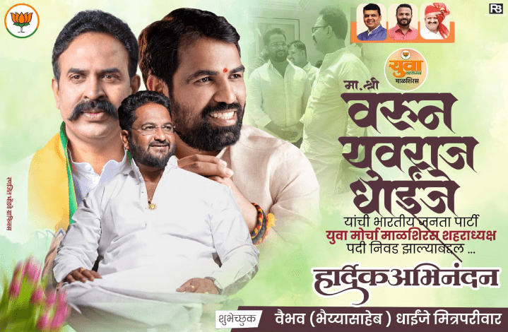 महाराष्ट्र राज्याचे ग्रामविकास व पंचायत राजमंत्री तथा सोलापूर जिल्ह्याचे कर्तव्यदक्ष पालकमंत्री नामदार जयकुमार गोरे, माढा लोकसभेचे कार्यतत्पर व पाणीदार माजी खासदार रणजितसिंह नाईक निंबाळकर, भारतीय जनता युवा मोर्चाचे राष्ट्रीय उपाध्यक्ष व माळशिरस विधानसभेचे लोकप्रिय दमदार माजी आमदार राम सातपुते, माळशिरस नगरपंचायतीचे माजी नगराध्यक्ष आप्पासाहेब देशमुख, यांच्या मार्गदर्शनाखाली माळशिरस शहर भाजपा युवा मोर्चाच्या अध्यक्षपदी युवा नेते वरूण युवराज धाईंजे यांची निवड करण्यात आलेली आहे.