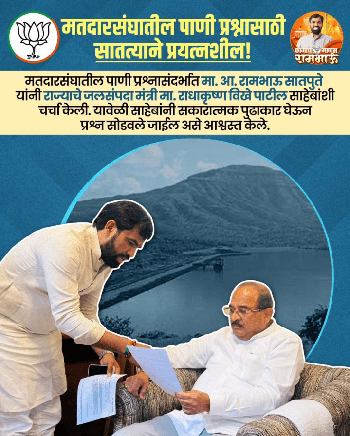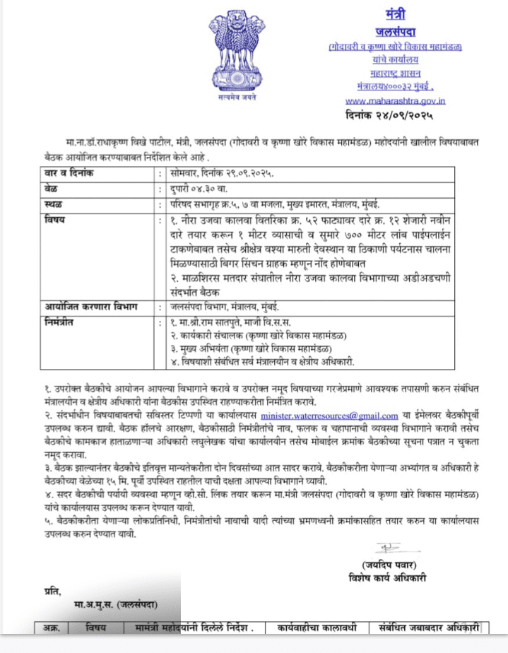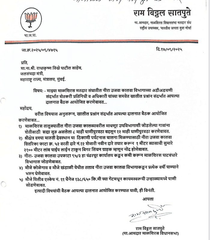महाराष्ट्र राज्याचे जलसंपदा मंत्री नामदार श्री. राधाकृष्ण विखे पाटील यांच्याकडे भारतीय जनता युवा मोर्चाचे राष्ट्रीय उपाध्यक्ष व माळशिरस विधानसभेचे लोकप्रिय दमदार माजी आमदार आरोग्यदूत राम सातपुते यांनी माळशिरस मतदारसंघातील निरा उजवा कालवा विभागाच्या अडीअडचणी संदर्भात शेतकरी प्रतिनिधी व अधिकारी यांच्या समवेत मंत्रालयात बैठक आयोजित करण्याची पत्रान्वये मागणी केलेली होती. जलसंपदा मंत्री राधाकृष्ण विखे पाटील यांनी शेतकऱ्यांची पाण्याच्या अडचणी पाहून सोमवार दि. 29/09/2025 रोजी दुपारी 4.30 वाजता मंत्रालयातील मुख्य इमारत सातव्या मजल्यावर बैठकीचे आयोजन केलेले आहे.