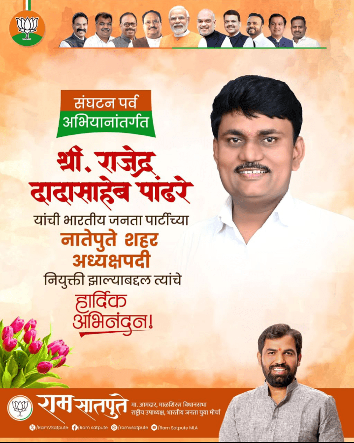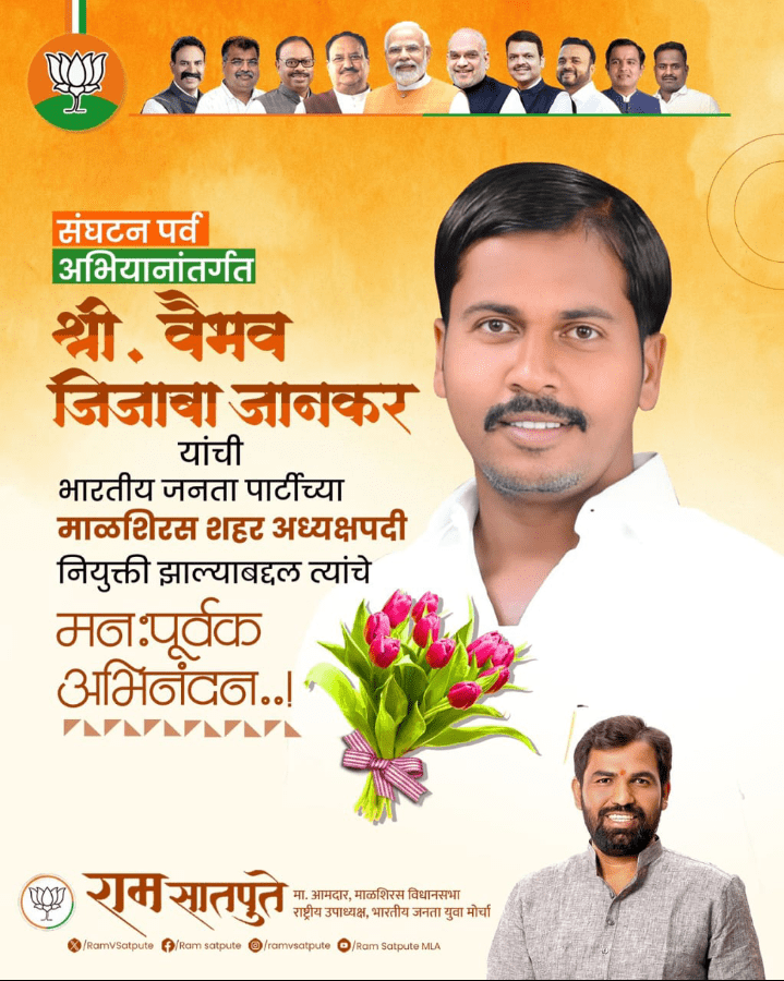 भारतीय जनता युवा मोर्चाचे राष्ट्रीय उपाध्यक्ष व माळशिरस विधानसभेचे लोकप्रिय दमदार माजी आमदार राम सातपुते यांच्या मार्गदर्शनाखाली भारतीय जनता पार्टी माळशिरस तालुका अध्यक्ष ॲड. शरदचंद्रजी मदने यांनी माळशिरस तालुक्यातील मोठ्या शहरातील शहराध्यक्ष पदांच्या निवडी जाहीर केलेल्या आहेत.