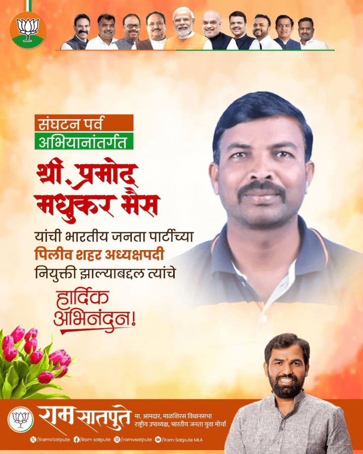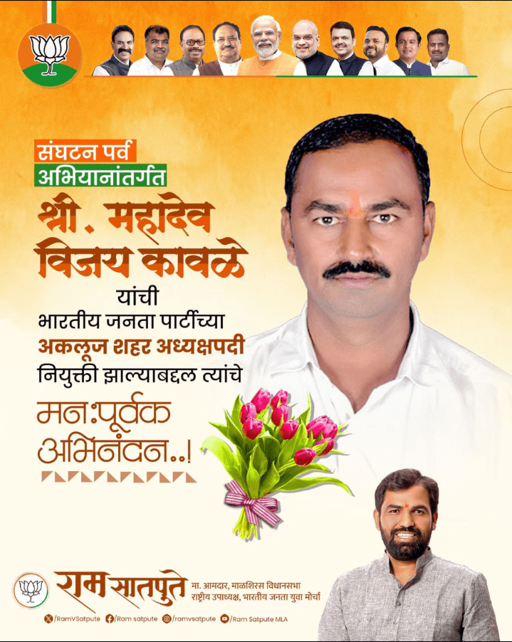भारतीय जनता पार्टी अकलूज शहराध्यक्ष महादेवराव कावळे, माळशिरस शहराध्यक्ष वैभवराजे जानकर, पिलिव शहराध्यक्ष प्रमोदजी भैंस, नातेपुते शहराध्यक्ष राजेंद्र उर्फ राजूशेठ पांढरे यांच्या निवडी जाहीर केलेल्या आहेत.