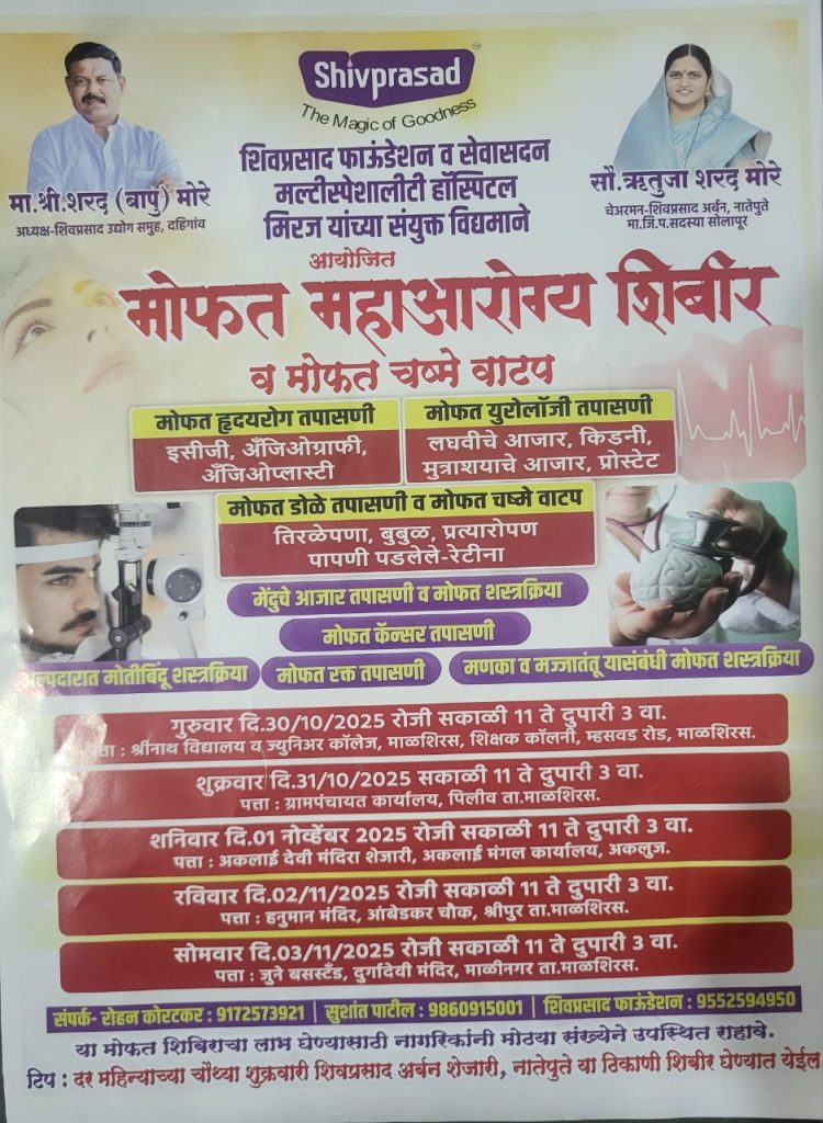 मोफत महाआरोग्य शिबिर व मोफत चष्मे वाटप कार्यक्रमाचे आयोजन….