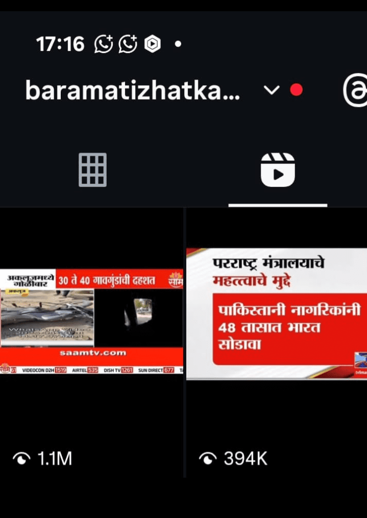 वेब पोर्टल व युट्युब चॅनल सोशल मीडियाच्या बरोबरीला इंस्टाग्राम सुरू केलेले होते. अल्पावधीमध्येच 5000 फॉलोवर्स इंस्टाग्रामवर झालेले आहेत. आत्तापर्यंत 371 पोस्ट टाकलेल्या आहेत. तर 379 फॉलोविंग आहे. इंस्टाग्राम वरील बातमी 1.1 M म्हणजे 11 लाख लोकांनी पाहिली आहे. दुसऱ्या सुद्धा बातम्या पाच लाख, सहा लाख, चार लाख, तीन लाख अशा पाहिलेल्या आहेत. महिन्याला इंस्टाग्राम वर 16 लाख लोकांची बातमी पाहिलेली नोंद झालेली आहे. फॉलोवर्स पाच हजार झालेले आहेत, त्याबद्दल बारामती झटका न्यूज वेब पोर्टल, युट्युब चॅनल, इंस्टाग्राम व फेसबुक सर्व हितचिंतक वाचक, प्रेक्षक, मित्रपरिवार व नातेवाईक यांच्या सहकार्याने सर्व काही झालेले आहे. त्याबद्दल बारामती झटका संपादक श्रीनिवास शिवाजीराव कदम पाटील, मु. पो. मळोली, ता. माळशिरस, जि. सोलापूर यांच्या वतीने सर्वांना गौरी गणपतीच्या हार्दिक शुभेच्छा… गौराई आगमनाच्या दिवशी 5000 फॉलोवर्स पूर्ण झालेले आहेत. पुढच्या गौरीगणपती येईपर्यंत 50 हजार फॉलोवर्स करण्याचा मानस आहे आपल्या सर्वांच्या सहकार्याची अपेक्षा आहे.