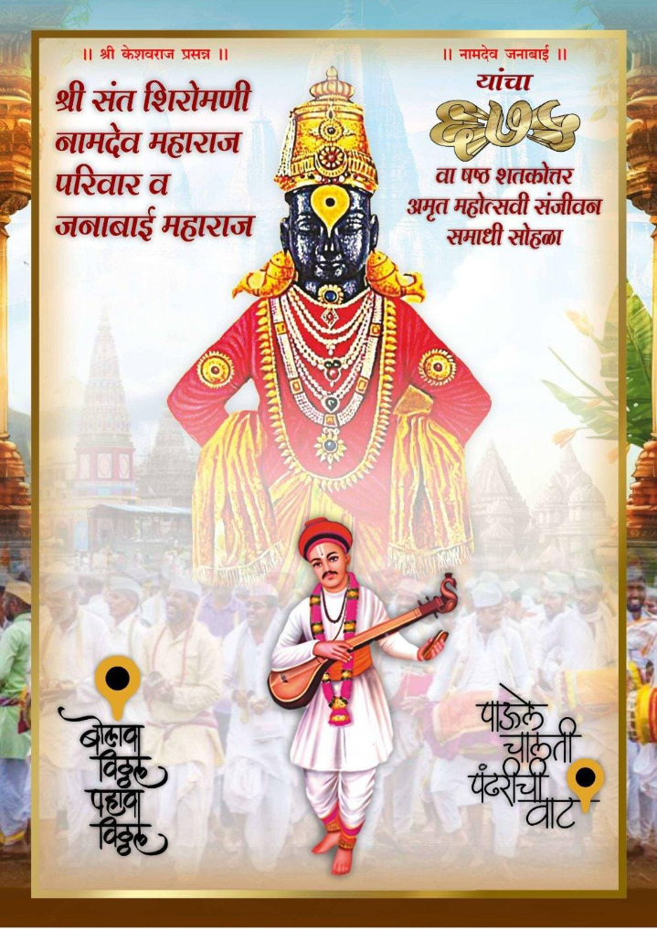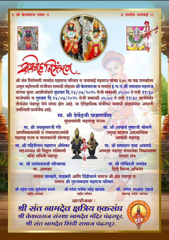 जय श्री संत नामदेव श्री विठ्ठलाच्या कृपेने श्री संत नामदेवरायांच्या आशीर्वादाने निश्चितपणे खऱ्या अर्थाने न भूतो, न भविष्यती, असा नेत्रदीपक, उत्साहवर्धक, नवचैतन्य रुपी, धार्मिक व आध्यात्मिक दृष्टीने सुसंस्कृत सोहळा श्री क्षेत्र पंढरी नगरीत दि. 23 व 24 जुलै (बुधवार/गुरुवार) रोजी मोठ्या थाटामाटात महाराष्ट्र राज्याचे लोकप्रिय मुख्यमंत्री देवेंद्र फडणवीस, सोलापूर जिल्ह्याचे कर्तव्यदक्ष पालकमंत्री जयकुमार गोरे, पंढरपूर मंगळवेढ्याचे आमदार समाधान आवताडे, प्रशांत परिचारक, महाराष्ट्र राज्याचे भाजपाचे आध्यात्मिक आघाडीचे अध्यक्ष तुषार भोसले यांच्या उपस्थितीत संपन्न होत आहे.