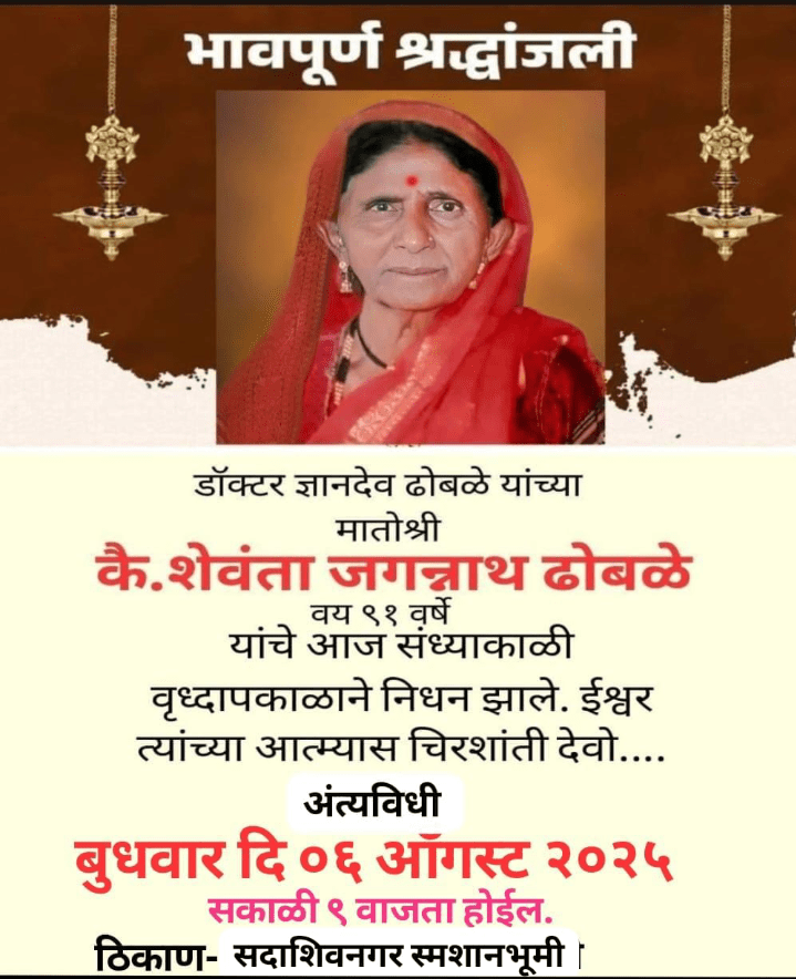 स्व. शेवंताबाई ढोबळे यांची अंत्ययात्रा बुधवार दि. ६/८/२०२५ रोजी सकाळी ९.०० वाजता राहत्या घरापासून (सदाशिवनगर) स्मशानभूमी पर्यंत निघणार आहे.