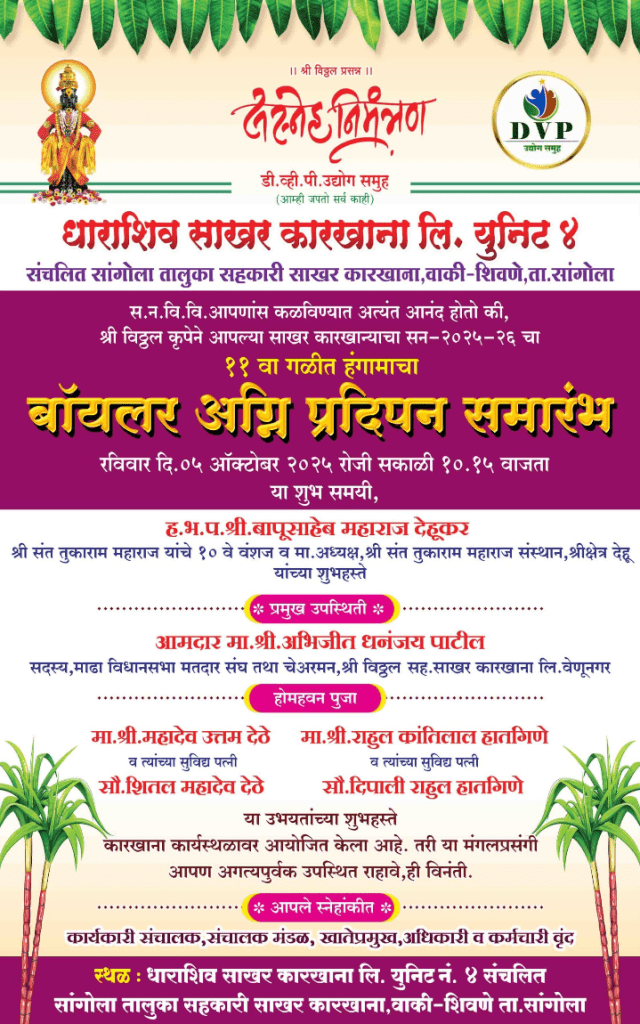 धाराशिव साखर कारखाना लिमिटेड युनिट ४ संचलित सांगोला तालुका सहकारी साखर कारखाना वाकी-शिवणे, ता. सांगोला या कारखान्याचा सन २०२५-२६ चा ११ वा गळीत हंगामाचा बॉयलर अग्नी प्रदीपन समारंभ श्री संत तुकाराम महाराज यांचे दहावे वंशज व श्री संत तुकाराम महाराज संस्थान श्रीक्षेत्र देहुचे अध्यक्ष ह. भ. प. श्री. बापूसाहेब महाराज देहूकर यांच्या शुभहस्ते तर माढा विधानसभा मतदार संघाचे सदस्य तथा श्री विठ्ठल सहकारी साखर कारखाना लिमिटेड वेणूनगर चे चेअरमन आमदार अभिजीत धनंजय पाटील यांच्या प्रमुख उपस्थितीत रविवार दि. ५ ऑक्टोबर २०२५ रोजी सकाळी १०.१५ वा. धाराशिव साखर कारखाना लिमिटेड युनिट ४ संचलित सांगोला तालुका सहकारी साखर कारखाना वाकी-शिवणे, ता. सांगोला येथे संपन्न होणार आहे.