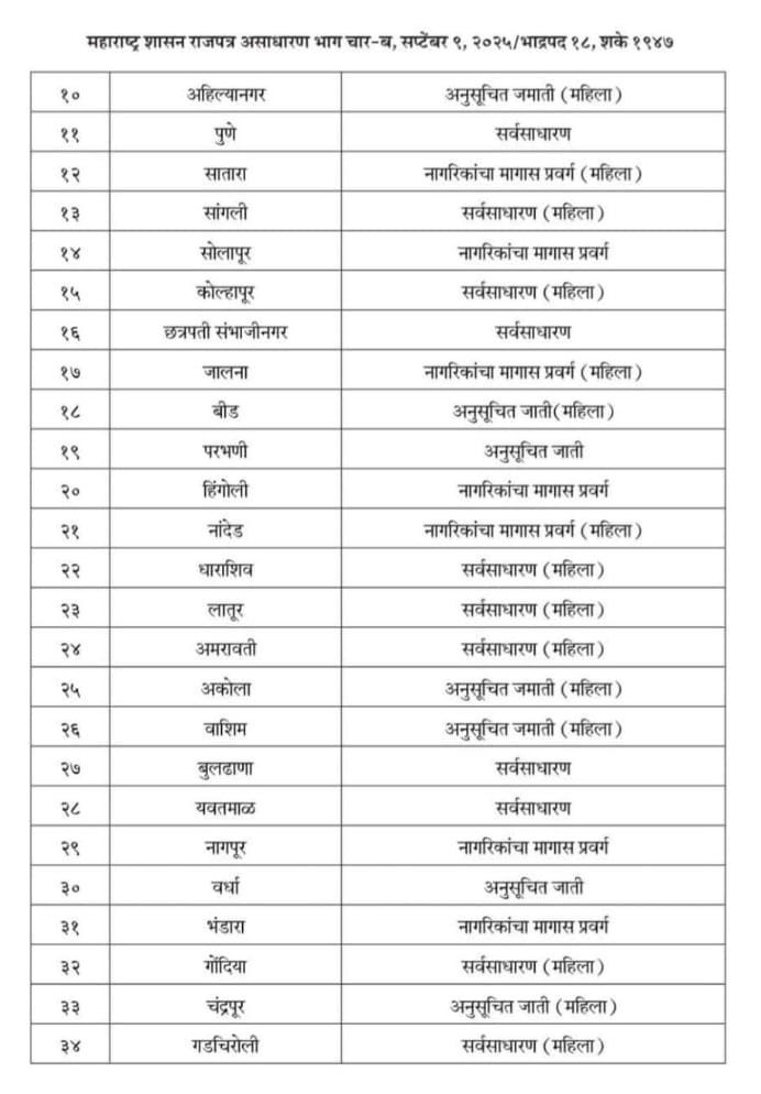 क्रमांक निपनि-२०२५/१२/पंरा-२. ज्याअर्थी मा. सर्वोच्च न्यायालयातील विशेष अनुमती याचिका क्रमांक १९७५६/२०२१ प्रकरणी मा. सर्वोच्च न्यायालयाने दि. ६ मे २०२५ रोजी पारित आदेशास अनुसरुन ग्रामविकास विभाग, शासन अधिसूचना क्रमांक निपनि-२०२१/प्र.क्र.११७/पं.रा.२, दिनांक ३० सप्टेंबर २०२२ अन्वये निश्चित केलेल्या आरक्षणाचा ज्या जिल्हा परिषदांनी लाभ घेतलेला नाही अशा जिल्हा परिषदांचे आरक्षण रद्द करुन, ग्रामविकास विभाग, शासन अधिसूचना क्रमांक निपनि-२०२५/प्र.क्र.१२/पंरा-२, दि. ९ सप्टेंबर २०२५ अन्वये राज्यातील अनुसूचित जाती, अनुसूचित जमाती, नागरिकांचा मागास प्रवर्ग (विमुक्त जाती व भटक्या जमातींसह) आणि महिला (अनुसूचित जाती, अनुसुचित जमाती आणि नागरिकांचा मागासवर्गांचा प्रवर्ग, विमुक्त जाती व भटक्या जमाती यातील महिलांसह) यांच्यासाठी राखून ठेवावयाच्या जिल्हा परिषदेच्या अध्यक्षांच्या पदांची संख्या विनिर्दिष्ट केली आहे.