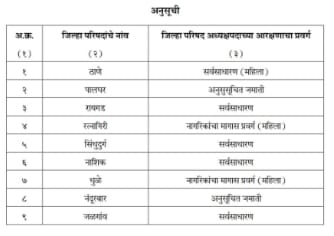 त्याअर्थी, आता महाराष्ट्र जिल्हा परिषद अध्यक्ष, उपाध्यक्ष, समित्यांचे सभापती आणि पंचायत समित्या (सभापती व उपसभापती) (पदांचे आरक्षण व निवडणूक) नियम, १९६२ मधील नियम २-ब, २-क व २-ड मधील तरतुदीनुसार महाराष्ट्र शासन, द्वारे राज्यातील भंडारा आणि गोंदिया या जिल्हा परिषदांकरिता त्यांना सध्या लागू असलेल्या आरक्षणाच्या कालावधीच्या समाप्तीच्या दिवसाच्या लगतनंतरच्या दिवसापासून सुरु होणाऱ्या अडीच वर्षाच्या कालावधीकरिता तसेच उपरोक्त जिल्हा परिषदा वगळून उर्वरित ३२ जिल्ला परिषदा गठीत होवून लगतनंतरच्या दिवसापासून सुरु होणाऱ्या अडीच वर्षाच्या कालावधीकरिता अनुसूचित जाती, अनुसूचित जमाती, नागरिकांच्या मागासवर्गाचा प्रवर्ग (विमुक्त जाती व भटक्या जमातींसह) आणि महिला (अनुसूचित जाती, अनुसूचित जमाती आणि नागरिकांच्या मागासवर्गाचा प्रवर्ग, विमुक्त जाती व भटक्या जमाती यातील महिलांसह) यांच्यासाठी राखून ठेवावयाच्या, राज्यातील जिल्हा आहे परिषदांच्या अध्यक्षांच्या पदांचे वाटप सोबतच्या अनुसूचीमध्ये दर्शविल्यानुसार नव्याने करण्यात येत आहे.