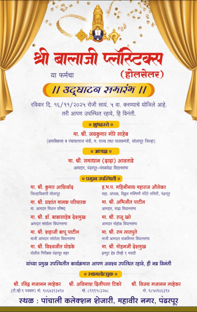 पंढरपूर येथे श्री बालाजी प्लास्टिक होलसेलर या फर्मचा उद्घाटन समारंभ ग्रामविकास व पंचायत राजमंत्री तथा सोलापूर जिल्ह्याचे पालकमंत्री ना. जयकुमार गोरे यांच्या शुभहस्ते तर पंढरपूर मंगळवेढा विधानसभेचे आमदार समाधानदादा अवताडे यांच्या अध्यक्षतेखाली रविवार दि. १६/११/२०२५ रोजी सायंकाळी ५ वाजता पांचाली कलेक्शन शेजारी, महावीर नगर, पंढरपूर येथे संपन्न होणार आहे.